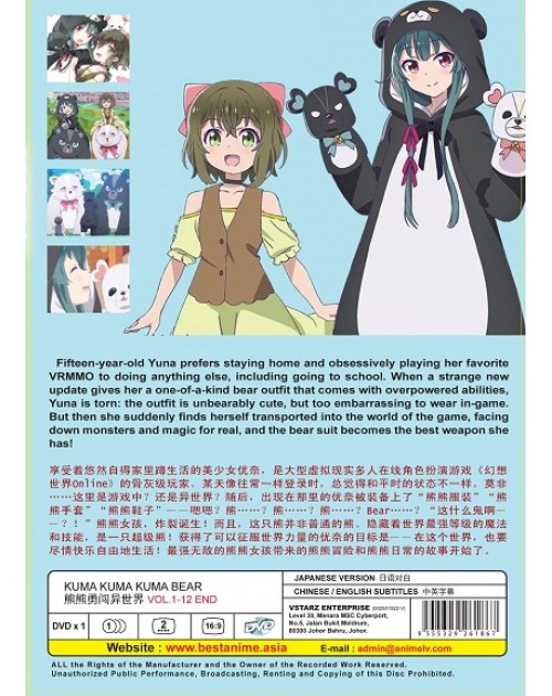 Fifteen-year-old Yuna prefers staying home and obsessively playing her favorite VRMMO to doing anything else, including going to school. When a strange new update gives her a one-of-a-kind bear outfit that comes with overpowered abilities, Yuna is torn: the outfit is unbearably cute, but too embarrassing to wear in-game. But then she suddenly finds herself transported into the world of the game, facing down monsters and magic for real, and the bear suit becomes the best weapon she has!
