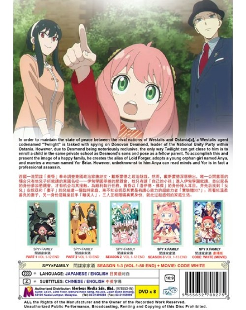 In order to maintain the state of peace between the rival nations of Westalis and Ostania[a], a Westalis agent codenamed "Twilight" is tasked with spying on Donovan Desmond, leader of the National Unity Party within Ostania. However, due to Desmond being notoriously reclusive, the only way Twilight can get close to him is to enroll a child in the same private school as Desmond's sons and pose as a fellow parent. To accomplish this and present the image of a happy family, he creates the alias of Loid Forger, adopts a young orphan girl named Anya, and marries a woman named Yor Briar. However, unbeknownst to him Anya can read minds and Yor is in fact a professional assassin. Neither Loid nor Yor are aware of each other's true identities, or that Anya knows their true professions. The family later takes in a dog with precognitive abilities whom they call "Bond". Despite these unknown factors and Twilight’s occasional lapse of common sense due to years of being a spy, he must learn to play the role of the perfect father and husband in order to carry out his mission.
